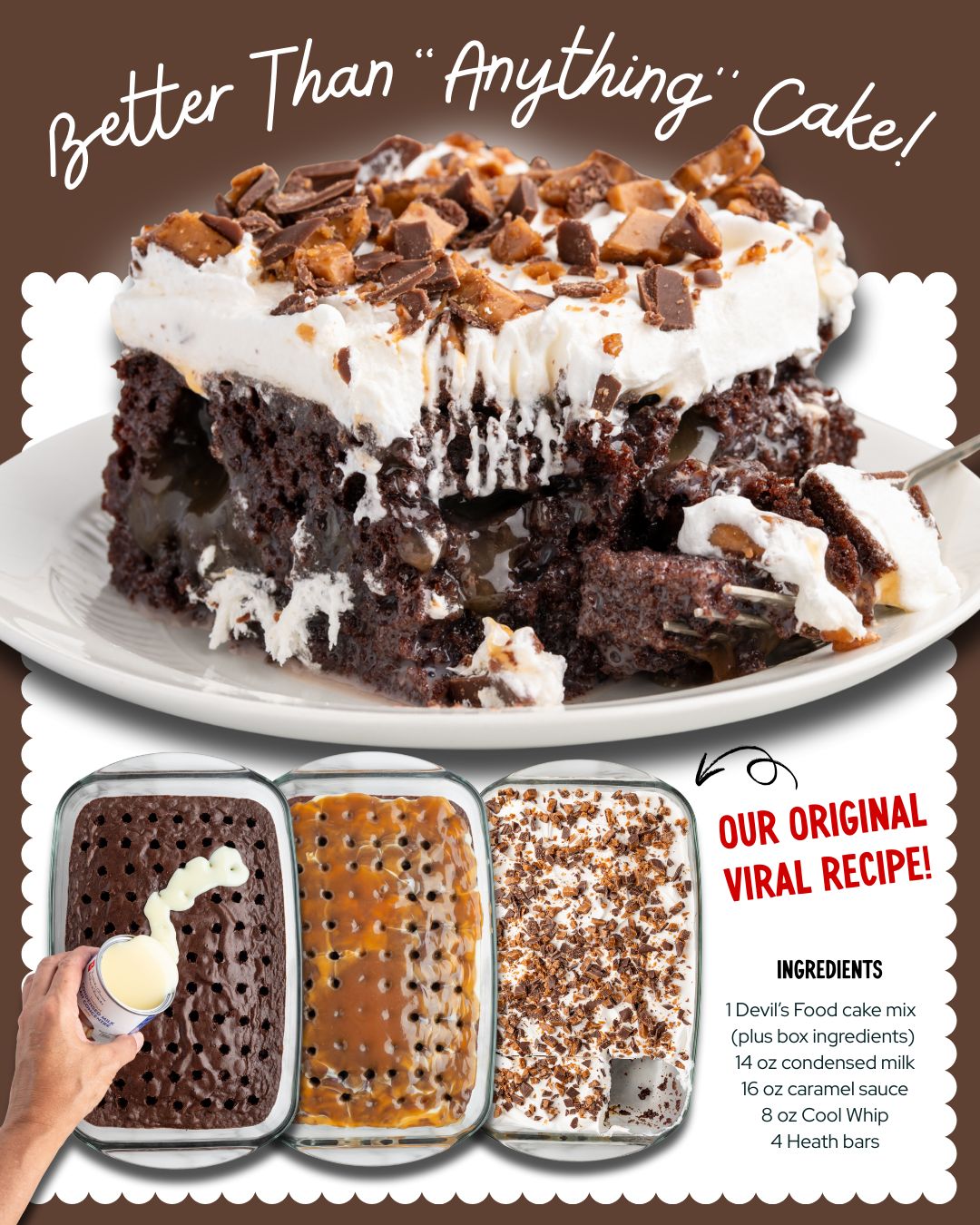 Better Than Anything Cake lives up to its name! This decadent, gooey dessert is layered with moist devil’s food cake, sweetened condensed milk, creamy Cool Whip, luscious caramel sauce, and crunchy crushed Heath bars.