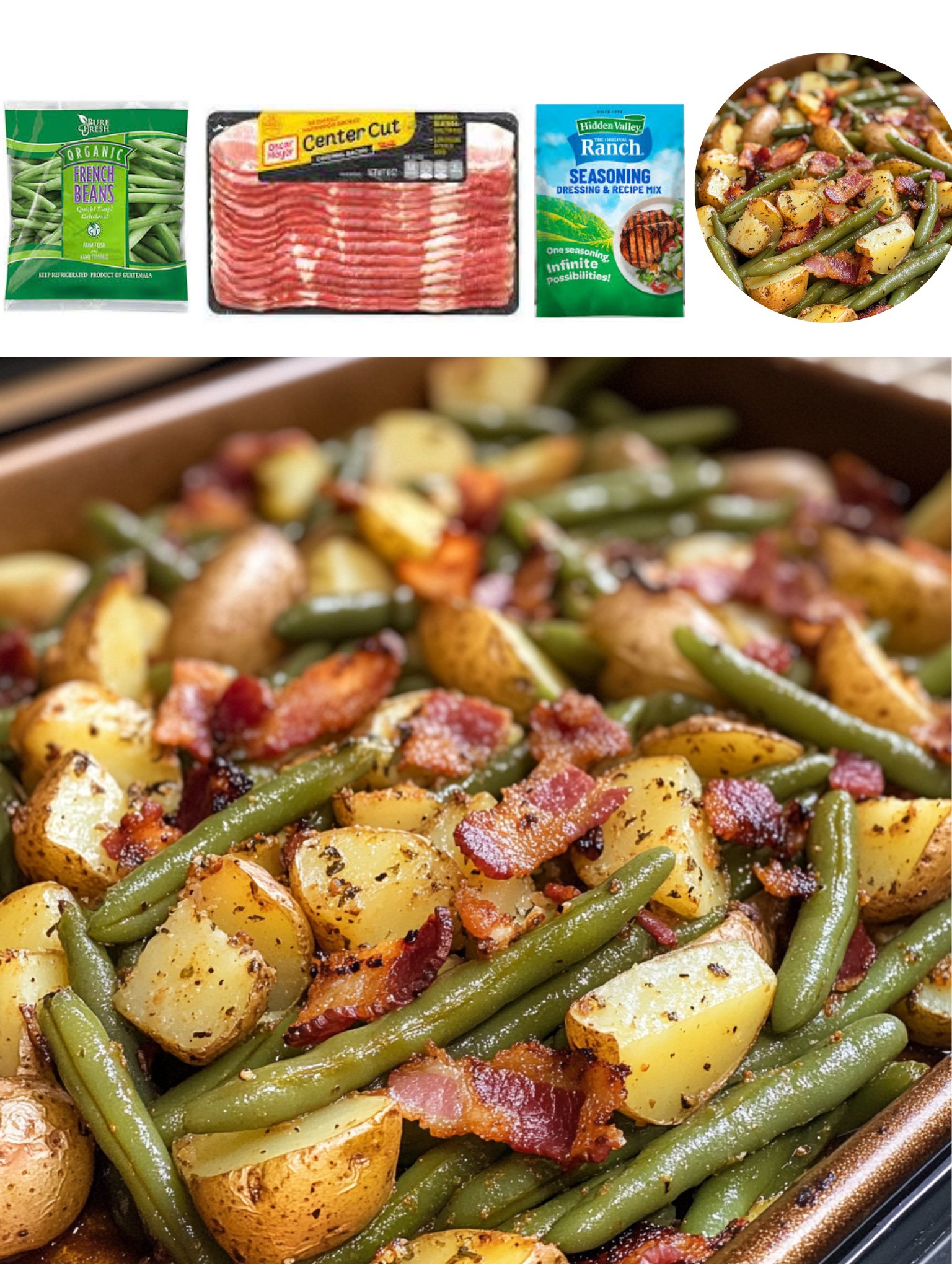 Fresh green beans provide a crisp, vibrant contrast to the creamy potatoes. Baby potatoes are ideal because they hold their shape well and develop a tender, buttery texture. Bacon adds smokiness and richness, while onion and garlic build a flavorful aromatic base. Ranch seasoning ties everything together with its signature tangy, herby profile.