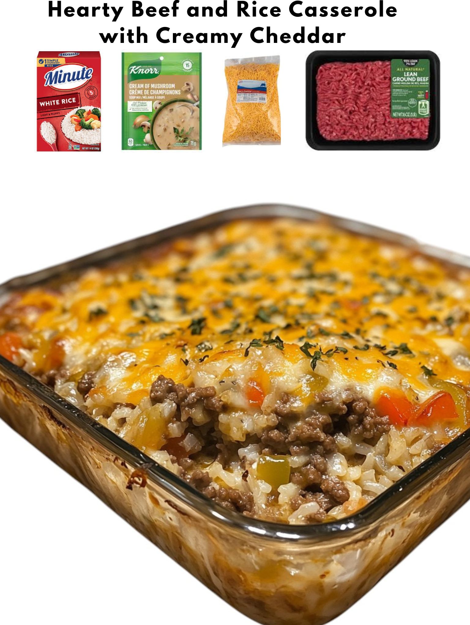This Hearty Beef and Rice Casserole with Creamy Cheddar is a comforting, filling, and easy-to-make dish that’s perfect for weeknight dinners or potluck gatherings. Juicy ground beef combines with cooked rice, creamy cheddar sauce, and savory seasonings to create a rich, one-dish meal that satisfies the whole family.