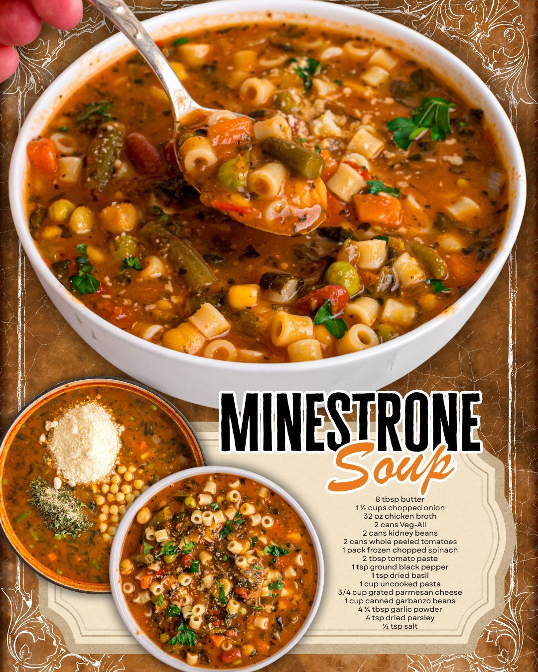 This recipe combines fresh onions and butter with a medley of canned and frozen vegetables, pasta, and beans, all seasoned with garlic, basil, and parsley. Topped with freshly grated Parmesan, it’s a wholesome dish that the whole family will love.