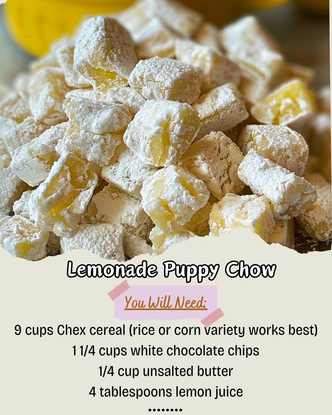 Lemonade Puppy Chow is a bright, zesty twist on the classic sweet snack mix. Crunchy Chex cereal
