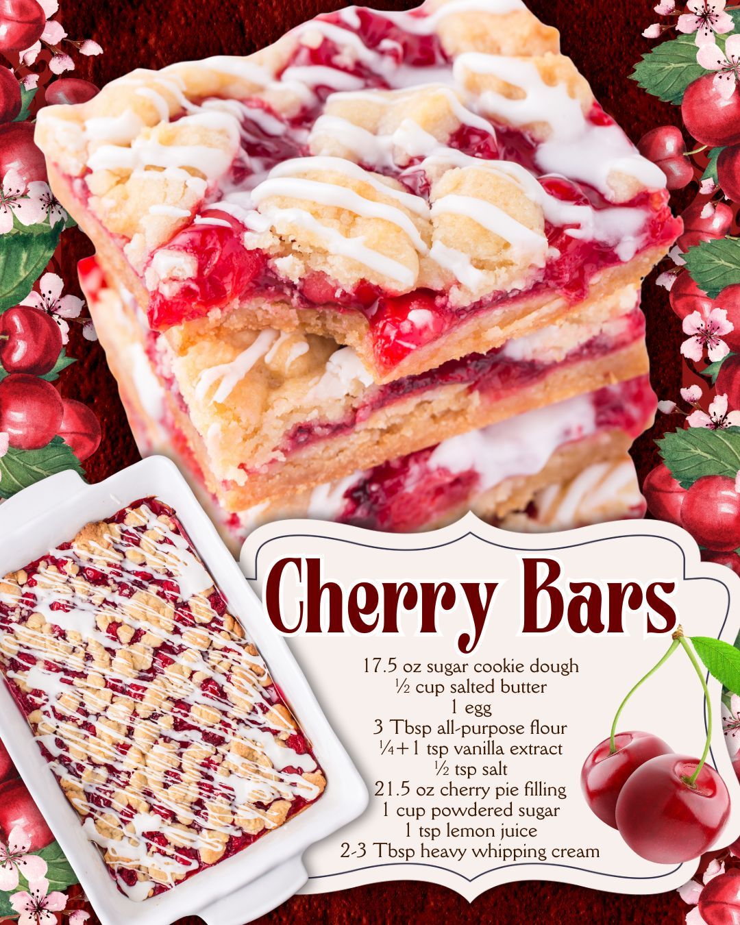 This version of cherry bars uses sugar cookie dough as a convenient base, saving time without sacrificing flavor. The addition of butter, vanilla, and a touch of flour enhances the texture, creating a soft yet sturdy foundation for the cherry pie filling. Once baked, the bars are finished with a smooth, lightly tangy glaze that brings all the elements together.
