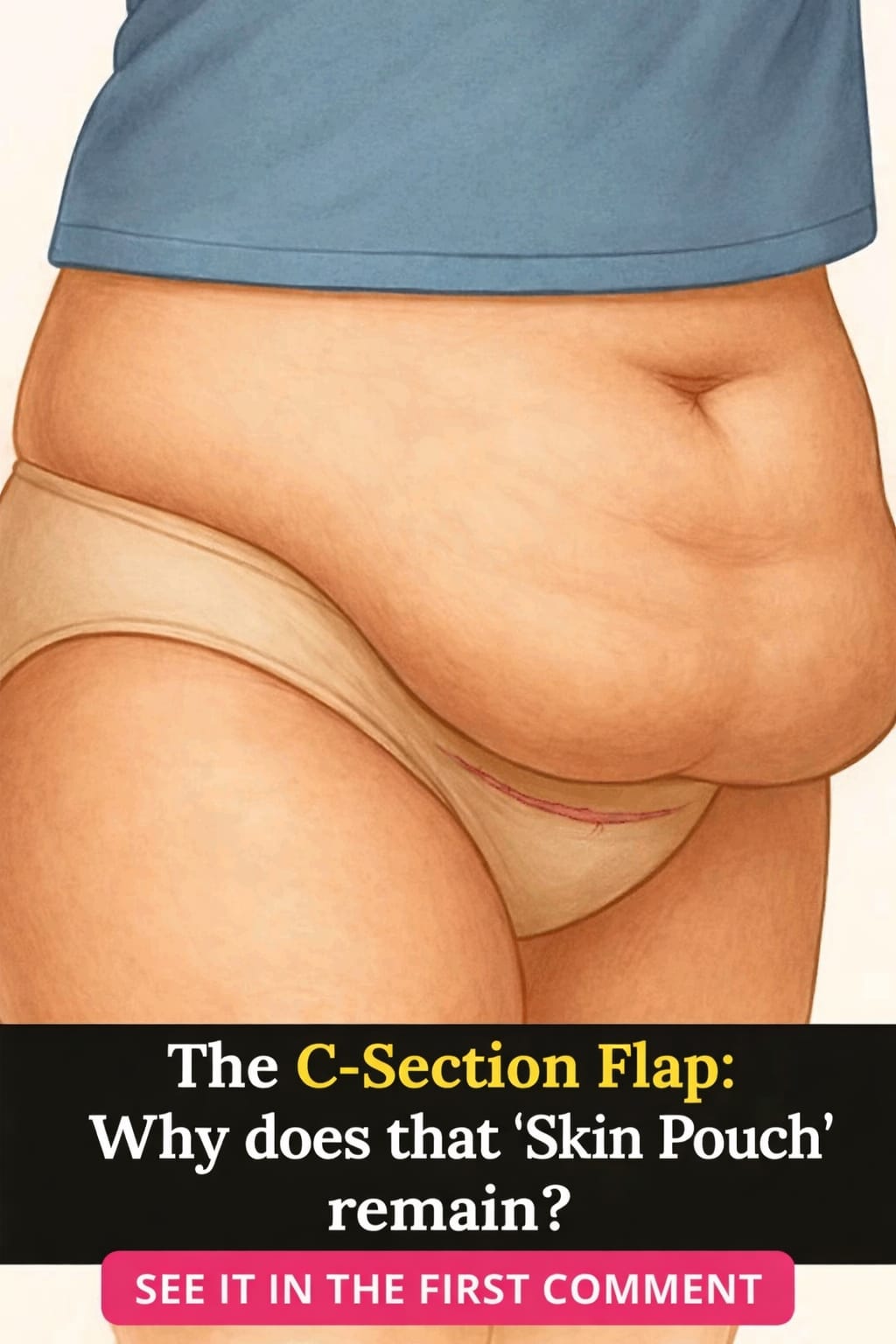 The lower abdomen is a common area for fat accumulation, particularly following hormonal changes associated with pregnancy. The incision made during a cesarean section involves multiple layers of tissue, and as the area heals, small internal retractions can occur, causing the skin to droop forward and contribute to the flap’s appearance.