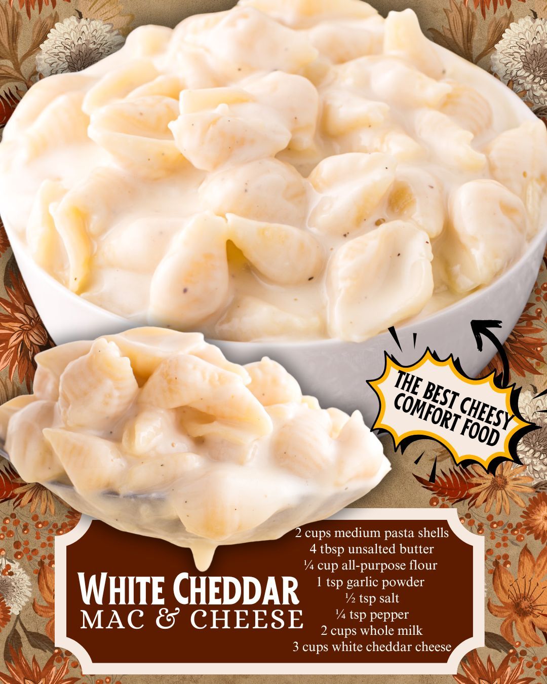 White Cheddar Mac and Cheese is the ultimate comfort food: creamy, cheesy, and satisfying. This dish combines tender pasta shells with a rich white cheddar sauce, flavored with garlic, and lightly seasoned for a perfectly balanced taste. Ideal for weeknight dinners, family meals, or cozy evenings at home, this recipe elevates classic mac and cheese with sharp white cheddar for a bold flavor.